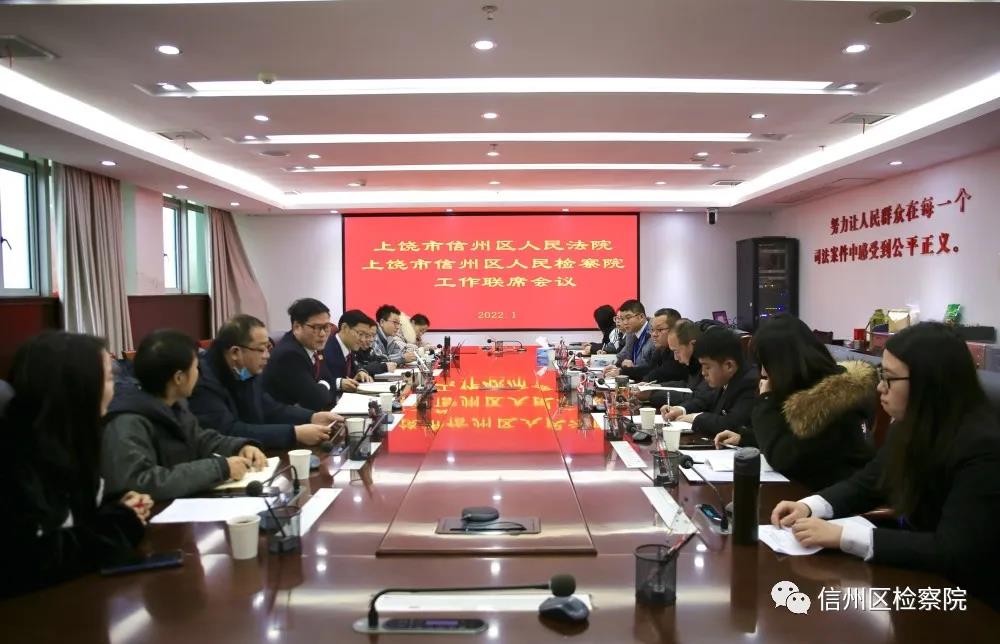 1月28日下午,信州区检察院、信州区法院召开了法检两院工作联席会。会议由信州区检察院检察长胡腾峰、信州区法院院长肖连华共同牵头在信州区法院召开,信州区检察院刑事检察业务部门分管领导、员额检察官、信州区法院刑事审判庭分管领导及员额法官均参加了会议。
