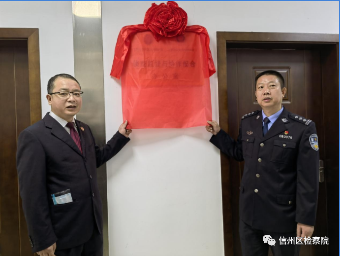 揭牌仪式在上饶市公安局信州分局举行,上饶市信州区人民检察院副检察长江华光、上饶市信州区公安局副局长夏进辉等出席了揭牌仪式。揭牌仪式结束后,双方召开第一次会议,就就建立完善监督制约、协作配合、信息共享等各项协作配合机制提出意见。一致认为要严格贯彻落实《意见》要求,强化沟通协调和衔接配合,共同维护执法司法公平正义;充分运用办公室平台,进一步加强协作配合,优化平台功能,统一执法司法理念,提升刑事诉讼质效;强化检警信息共享实现数据双向交换、共享,探索接入信息共享平台开放机制,推动案件办理更加规范、高效。