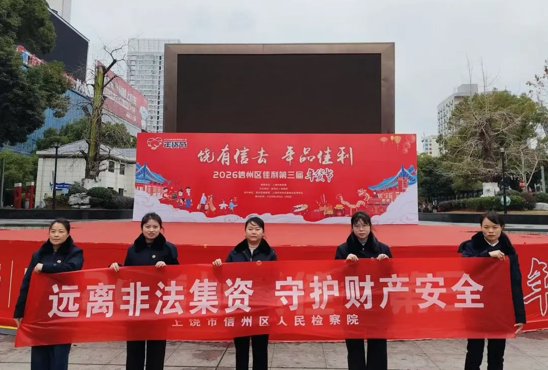 岁末年初,年味渐浓,消费理财进入旺季,也是非法集资犯罪的高发期。正值信州区“饶有信去 年品佳利”2026年第三届年货节火热开展之际,为切实守护群众财产安全,筑牢非法集资防范防线,近日,信州区检察院联合信州区法院、信州区金融办、信州区普惠金融中心等部门,在年货节现场,开展了一场以“远离非法集资 守护财产安全”为主题的普法宣传活动,将法治“年货”送到群众身边,用司法温度护航新春佳节。