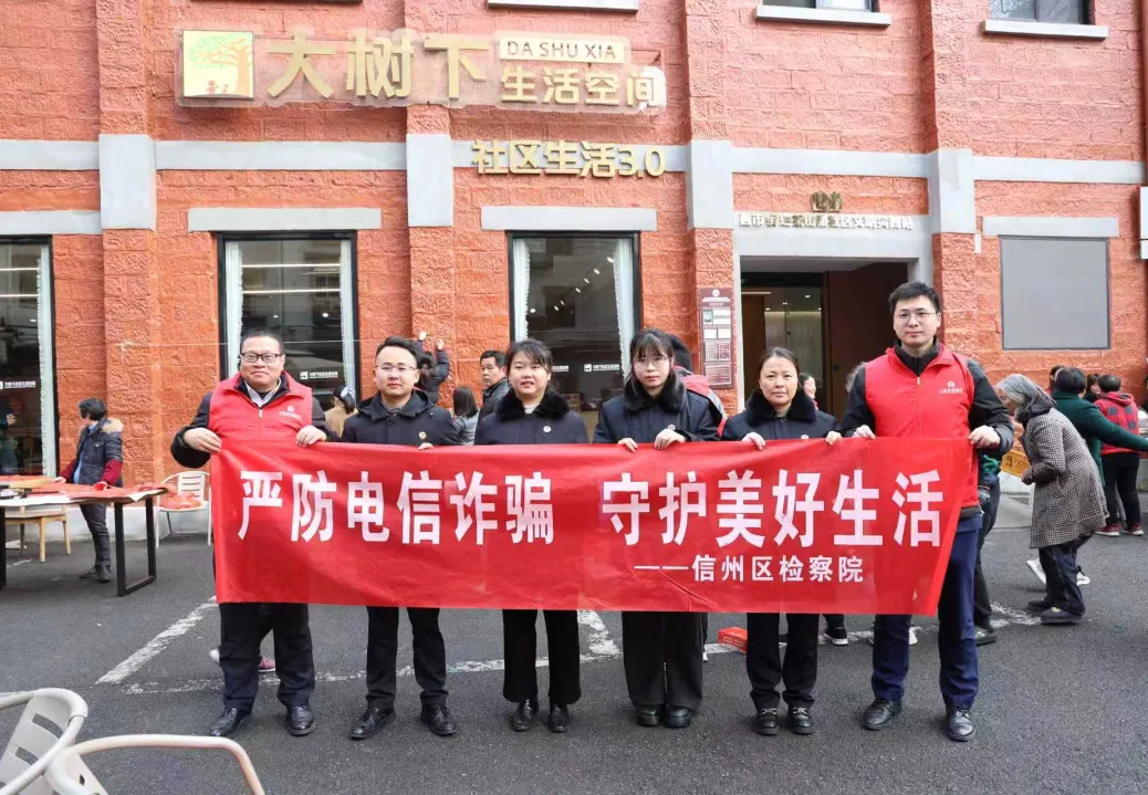 信州区西市街道茶山路社区中心的这棵枫杨树下,亲子学堂、老年食堂、新春游园会,社区生活丰富多彩,温馨热闹。值此岁末年初之际,为切实预防电信网络诈骗高发态势,营造平安祥和的节日氛围,信州区检察院走进茶山路社区,开展了一场以“打击电信诈骗 构建和谐社会”为主题的普法宣传活动,把反诈知识送到群众家门口,把法治温暖送到居民心坎上,为群众平安过年保驾护航。